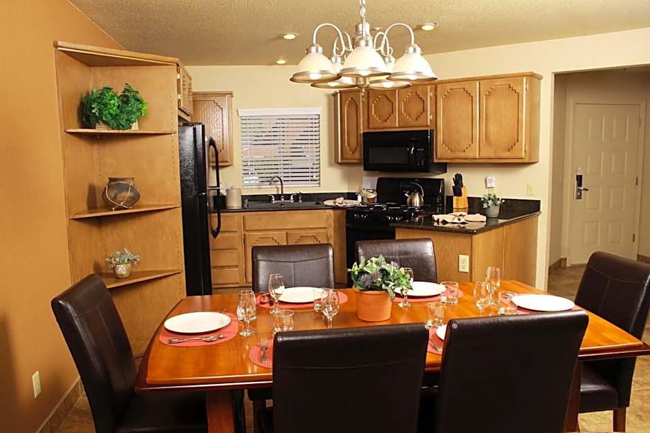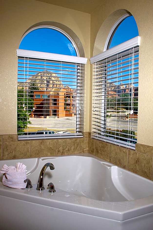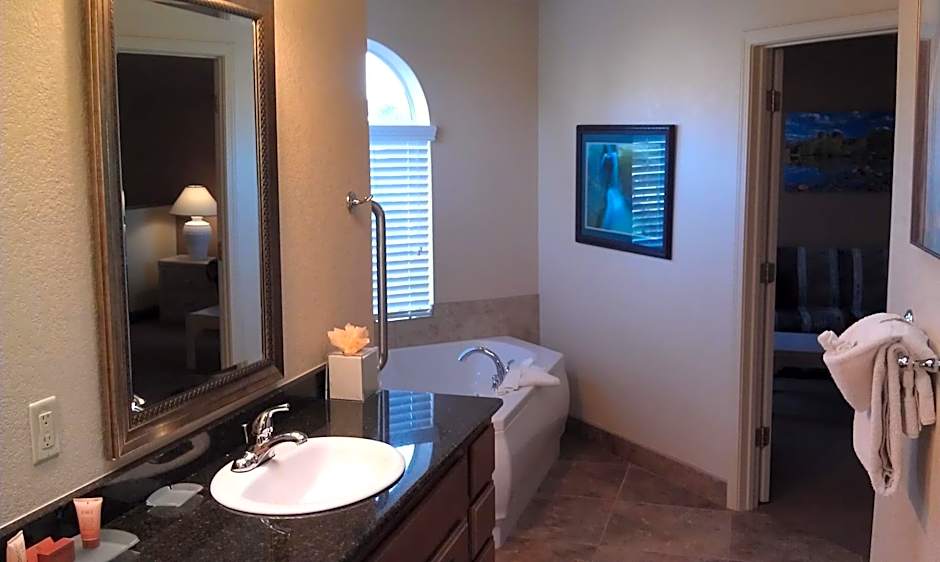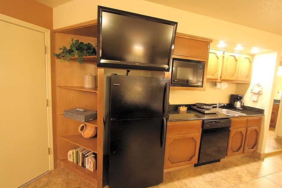 This spacious suite features a full kitchen, a living room with a seasonal gas fireplace and flat screen televisions. A private 2nd bedroom with a kitchenette, a private terrace and balcony and a spa bath are also included.